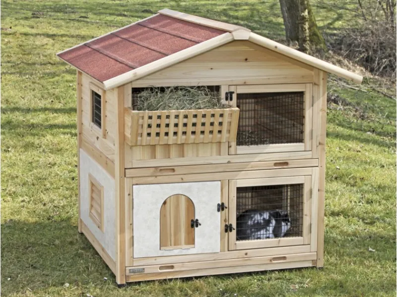 Durch die doppelten Wände im unteren Schlafbereich, welche mit Styropor ausgekleidet sind, ist das Nagerhaus für Sommer und Winter geeignet. Die obere Etage ist über eine eingebaute Aufstiegshilfe erreichbar. Der Balkon kann als Heuraufe verwendet werden und ist gleichzeitig ein toller Blickfang. Die herausziehbaren Kunststoffwannen erleichtern die Reinigung. Das Nagerhaus ist mit Hilfe eines Stecksystems einfach und schnell zu montieren. Der Schlafbereich im unteren Stockwerk ist mit einer Schiebetüre verschließbar.