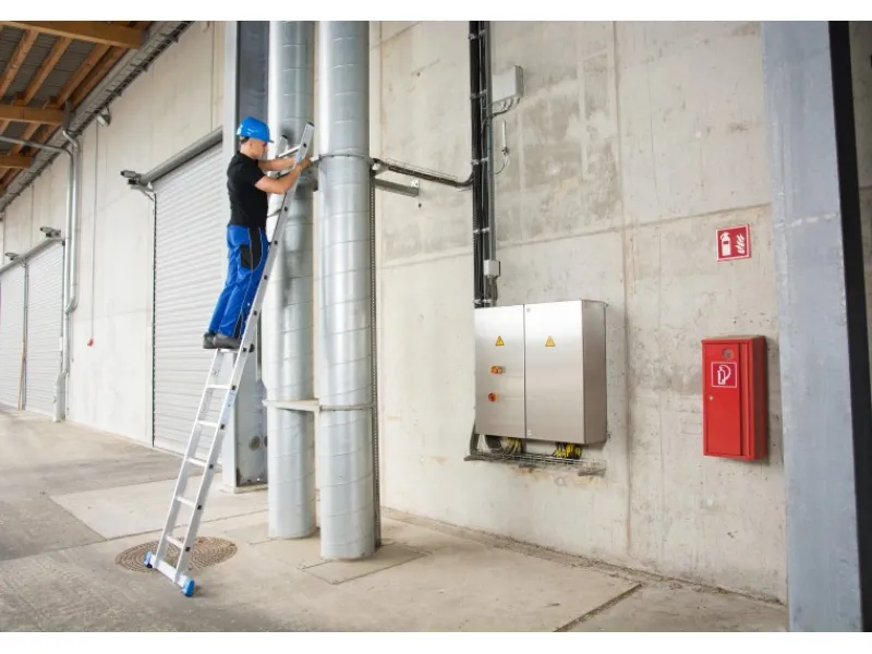 Mit einer Außenbreite von 420 mm ermöglicht sie den bequemen Auf- und Abstieg. Dabei sorgen rutschsichere, rundum profilierte und 30 mm tiefe Sprossen für einen sicheren Stand.