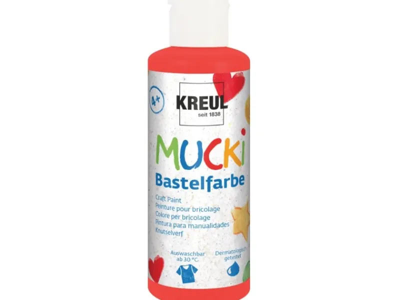 Ein Gemälde für Oma, ein Schatzkästchen für Mama oder ein Werkzeugkoffer für Papa. Wenn Selbstgebasteltes aus Papier, Karton, Keilrahmen, Holz, Stein, Terrakotta, Modelliermasse oder Glas bunt werden soll, dann ist die Mucki Bastelfarbe die richtige Wahl. Sie ist sofort einsatzbereit, mit dem Pinsel leicht verstreichbar und trocknet matt deckend auf. Spannende Techniken wie die Abklatschtechnik, Stempeln und Drucken, Schablonieren und Murmeln machen mit der Bastelfarbe aus dem Hause Kreul besonders viel Spaß. Sollte ein Klecks Farbe daneben gehen, ist das nicht schlimm: Mucki Bastelfarbe ist leicht von der Haut abwaschbar und lässt sich aus den meisten Textilien ab 30 °C gut auswaschen.