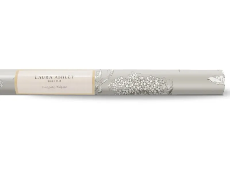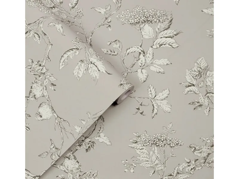 Eine moderne Variante des traditionellen Elderwood-Designs von Laura Ashley mit handgezeichneten Blüten und Beeren auf einem modernen stahlgrauen Hintergrund.