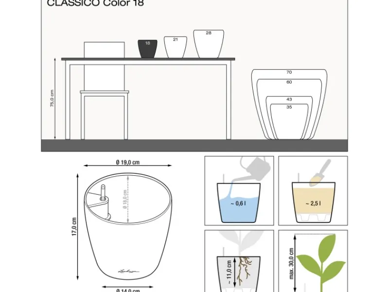 Der stilvolle Klassiker passt perfekt auf Regale, Fensterbänke, Beistelltische und kleinere Flächen im Innen- und Außenbereich. Für die optimale Versorgung der Pflanzen sorgt das bewährte Lechuza® Erd-Bewässerungs-System.