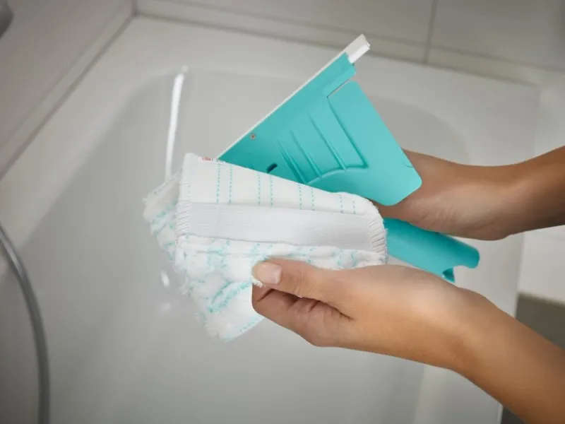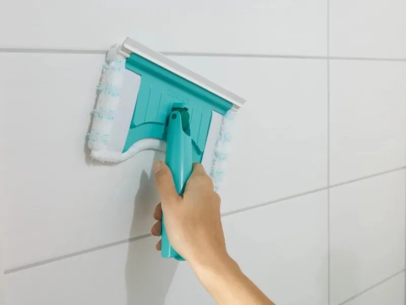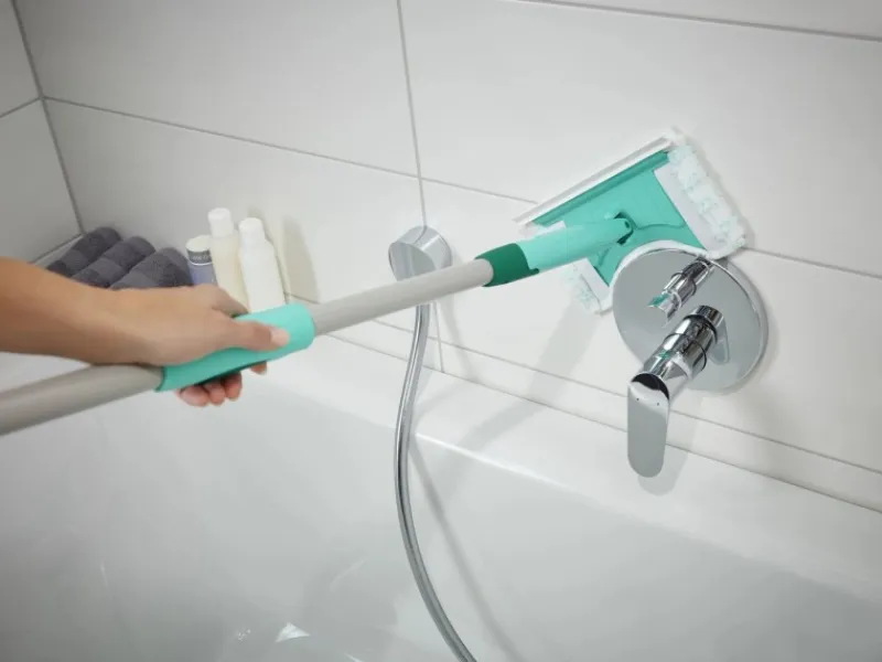 Seine runden Aussparungen passen sich exakt den Armaturen an und hässliche Schmutzränder werden so zuverlässig und bequem entfernt. Mit Hilfe des rundum beweglichen Gelenks lässt sich der Wannen- und Fliesenwischer problemlos in jede Ecke und Kante führen. Seine integrierte Abziehlippe sorgt nach dem feuchten Wischen für streifenfreien Glanz.