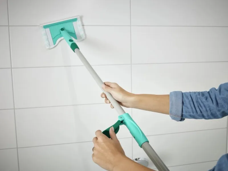 Bei schwer zugänglichen Stellen kommt der Teleskopstiel zum Einsatz, der sich auf eine Arbeitslänge von 75 cm bis 120 cm ausziehen lässt. Mit diesem Fliesen- und Wannenwischer können Sie selbst die hintersten Ecken von hartnäckigem Schmutz befreien und Ihrem Bad einen neuen Glanz verleihen.