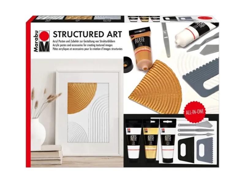 ist besonders beliebt für Strukturbilder mit 3D-Effekt, die sich mit dem Marabu Structured Art “All-in-One“-Set ganz einfach selbst gestalten lassen. Dafür die Acryl-Pasten großzügig auf den Maluntergrund spachteln und anschließend mit den Effektspachteln individuelle Muster formen.