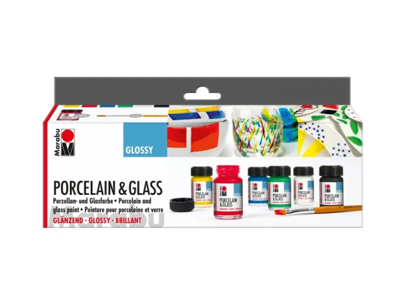 Set enthält: 6 x 15 ml Porcelain & Glass Glossy (Sonnengelb, Kirsche, Enzian, Apfel, Weiß, Schwarz), 1 x Marabu Pinsel Universal flach Gr. 8