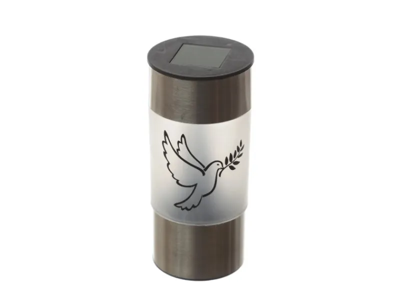 Diese LED Grablichter mit der Friedenstaube als Motiv werden durch das am Deckel verbaute Solarpanel aufgeladen und leuchten bei Einbruch der Dämmerung.