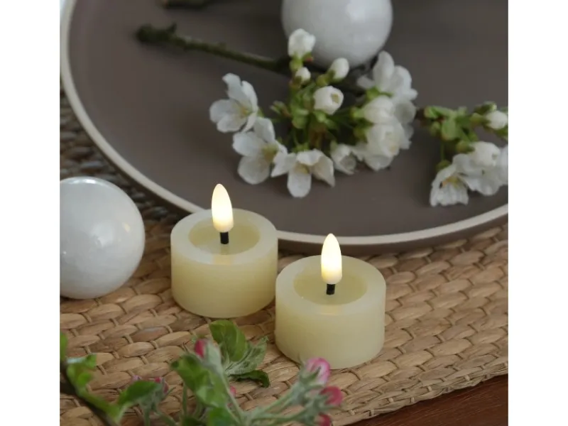 Die Flamme dieser LED Teelichter ist eine sogenannte 3D Flamme. Sie hat die Form einer echten Flamme und flackert leicht in einem warmweißen Licht. So sieht der Effekt besonders realistisch aus. Die Flamme ist in einem schön geformten Wachstrichter eingelassen. Das ähnelt einem echten Teelicht, bei dem das Wachs schon etwas geschmolzen ist.Dieses 2er Set Teelichter ist aus Echtwachs und perfekt geeignet, um die ganze Wohnung mit kleinen flackernden Lämpchen zu dekorieren.