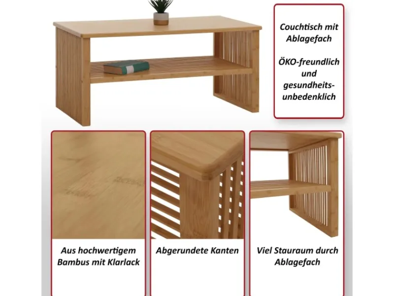 – Der Bambus-Couchtisch N80 überzeugt mit natürlichem Design und Funktionalität. Gefertigt aus Gutem Bambus mit Klarlack, bietet er ein großzügiges Ablagefach und abgerundete Kanten. Leicht und robust, vereint er Stil und Sicherheit in einem Möbelstück.