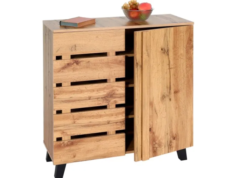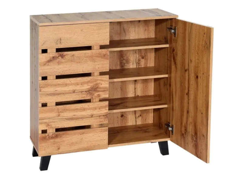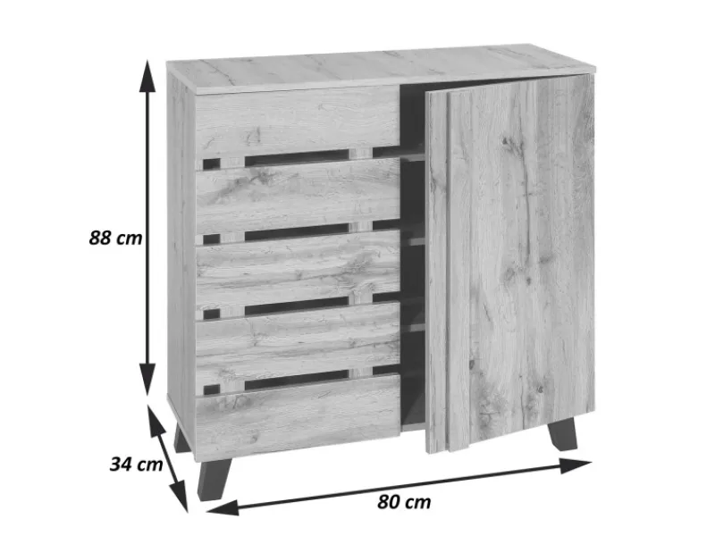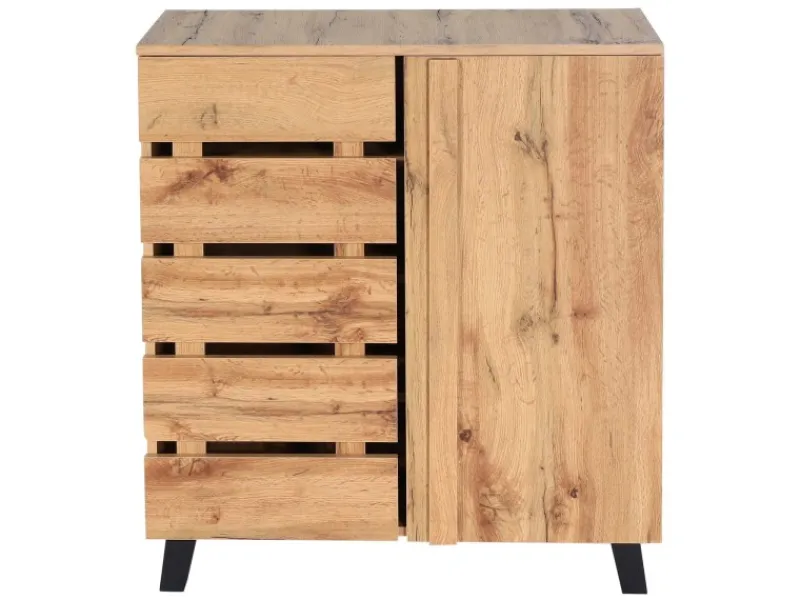Entdecken Sie die Kommode M46 – die perfekte Ergänzung für Ihr Zuhause! Diese Anrichte verleiht Ihrem Raum einen Hauch von Eleganz und Funktionalität. Mit ihren einzigartigen Merkmalen ist sie ein echtes Must-Have für alle, die stilvolle Aufbewahrungslösungen suchen. Der Schrank besticht durch seine Struktur und zwei wunderschönen Türen, von welchen eine mit einem einzigartigen Paletten-Design versehen ist. Diese Detailverliebtheit verleiht Ihrer Einrichtung einen modernen und zeitgemäßen Look, der sofort ins Auge fällt.