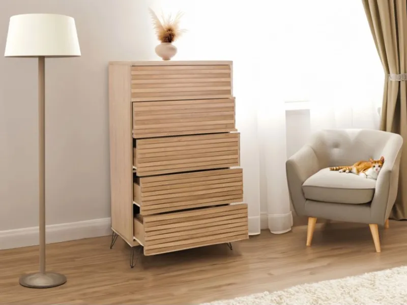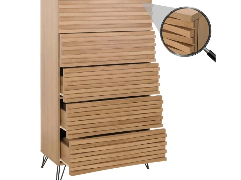 – Die Kommode bietet mit ihren fünf geräumigen Schubladen ausreichend Platz für Ihre Utensilien. Diese sind ideal, um alles von Büchern über Geschirr bis hin zu Multimedia-Zubehör stilvoll und geordnet aufzubewahren.