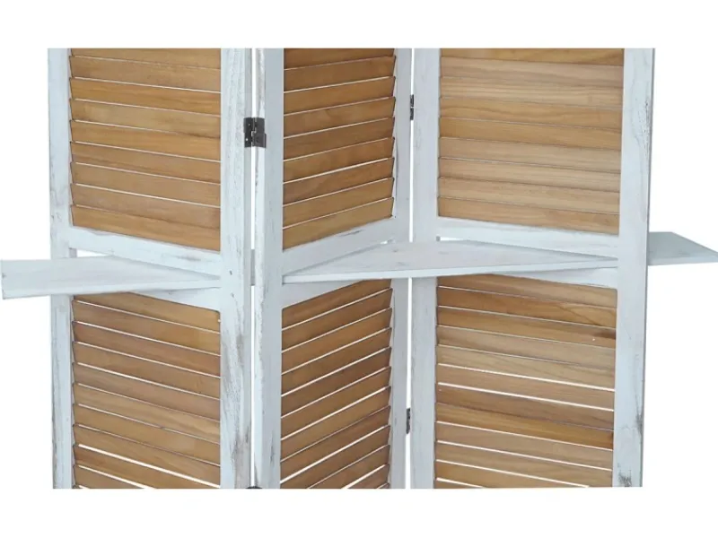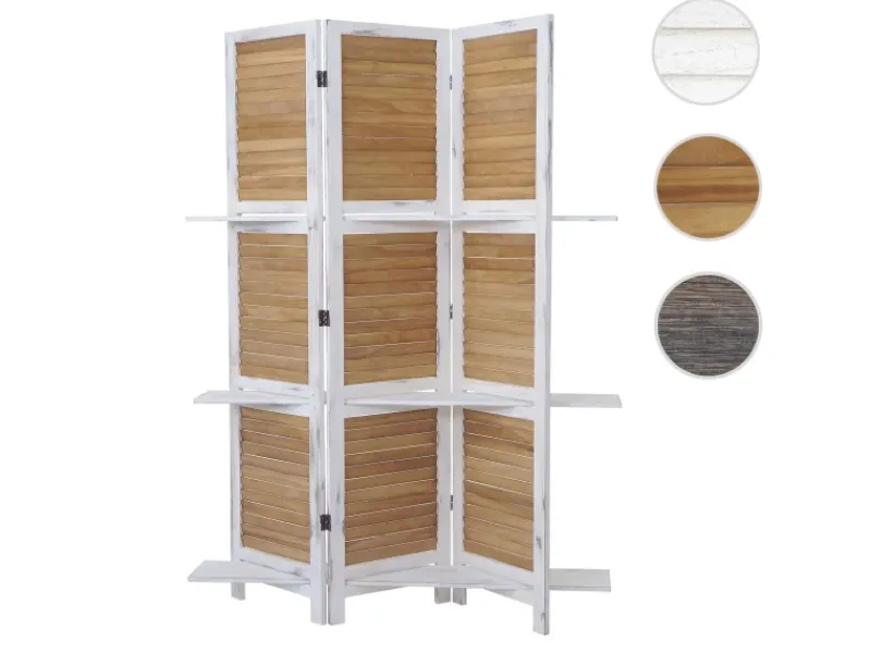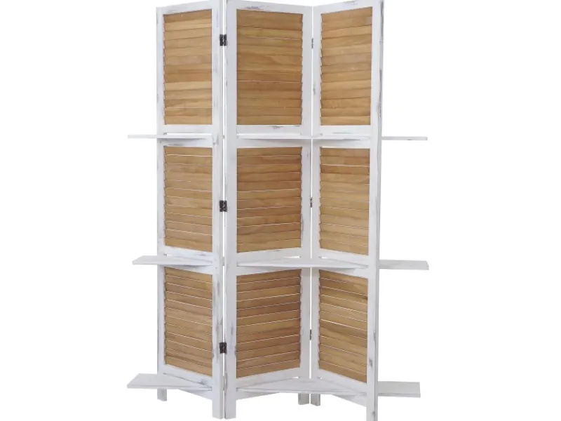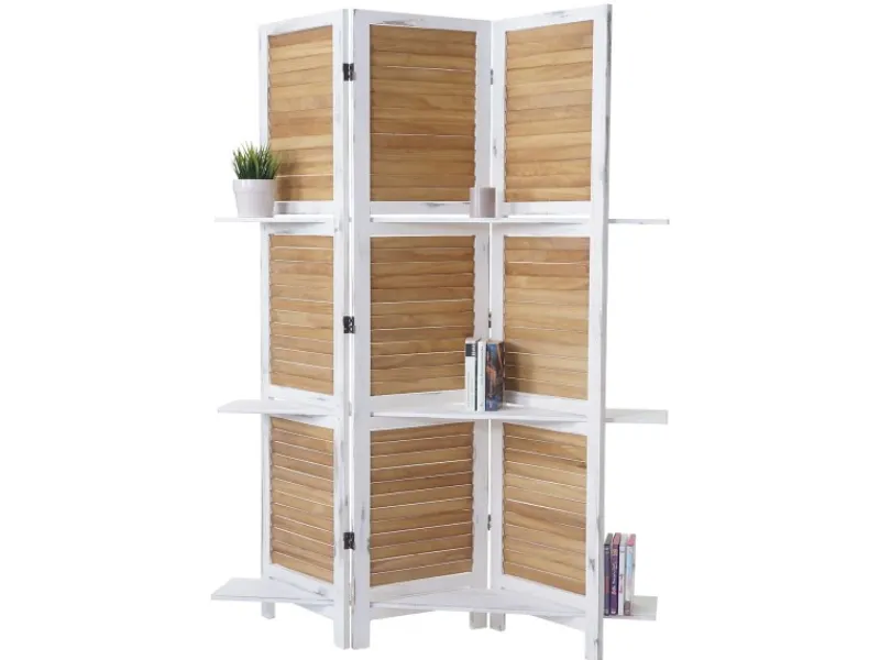 Dieser zeitlose Paravent ist ein echter Hingucker! Doch man sieht nur hin, nicht durch – wäre ja auch blöd sonst. Somit eignet er sich hervorrragend als Raumtrenner, ganz egal ob Sie ihn im Eingangsbereich, im Wohnzimmer, im Schlafzimmer oder im Kinderzimmer platzieren! Die drei Regalböden werden durch die Flügel durchgeschoben. In den so entstandenen Ecken können Bücher oder Dekoartikel gestellt werden. Das lockert die Optik auf und schafft Blickpunkte.