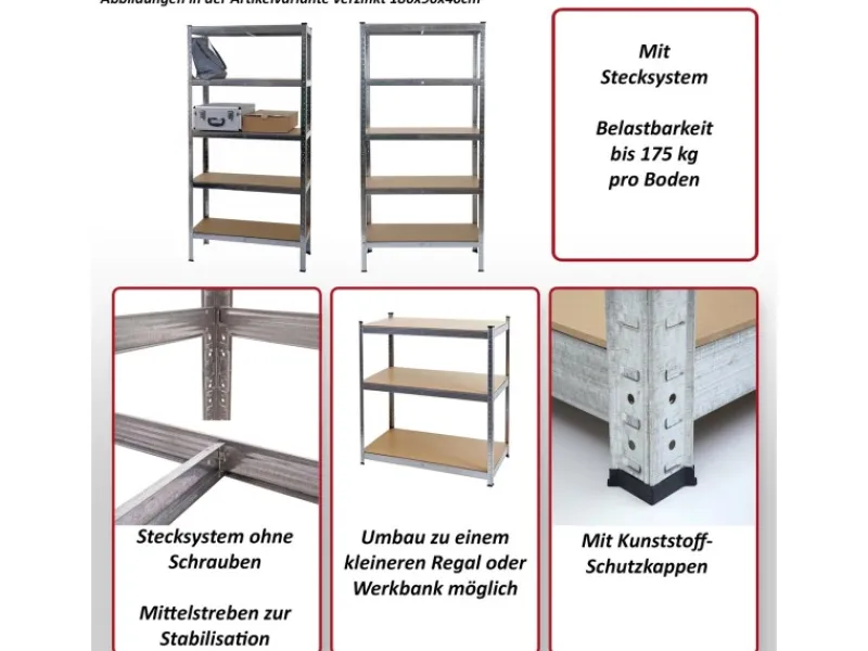 – Dieses praktische Steckregal kann vollkommen ohne Werkzeug montiert werden und ist trotzdem je Boden mit einer Traglast von bis zu 175 kg ausgestattet, durch diese hohe Belastbarkeit eignet es sich für die Garage, den Keller oder auch für Lagerräume.