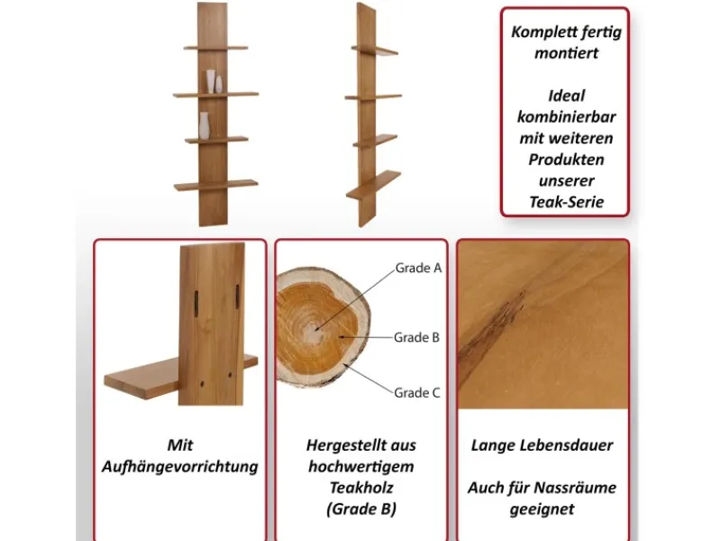 – Unser Teakholz-Wandregal vereint natürliche Schönheit mit erstklassiger Qualität des Teakholzes in hochwertigem Grade B. Komplett montiert geliefert, spart das Regal Zeit und Mühe bei der Installation.