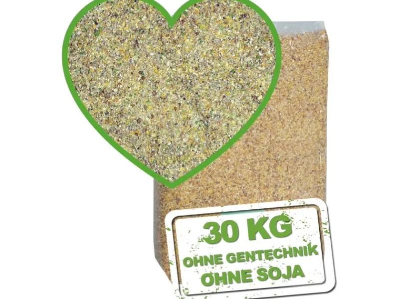 gebrochener Mais, Milokorn, Weizen, gelbe Hirse, gebrochene Erbse, Muschelgrit, Leinsamenöl