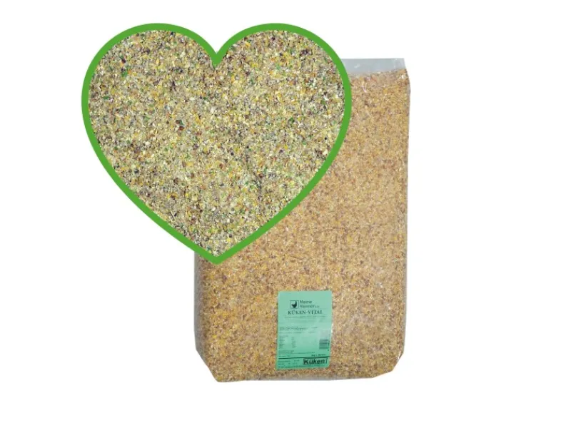 Das KÜKEN-VITAL wurde noch feiner gemahlen und mit Erbsen versehen, die essentielle Aminosäuren liefern. Auch haben wir jetzt feines Maismehl aus der Region hinzugefügt. Wie beim beliebten KÖRNER-VITAL, verzichten wir weiterhin bei unserem eigenen Kükenfutter auf den Einsatz von Zutaten, die nicht unbedingt in ein Kükenfutter reingehören.