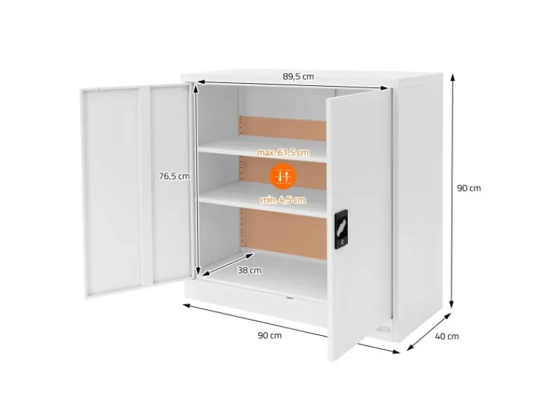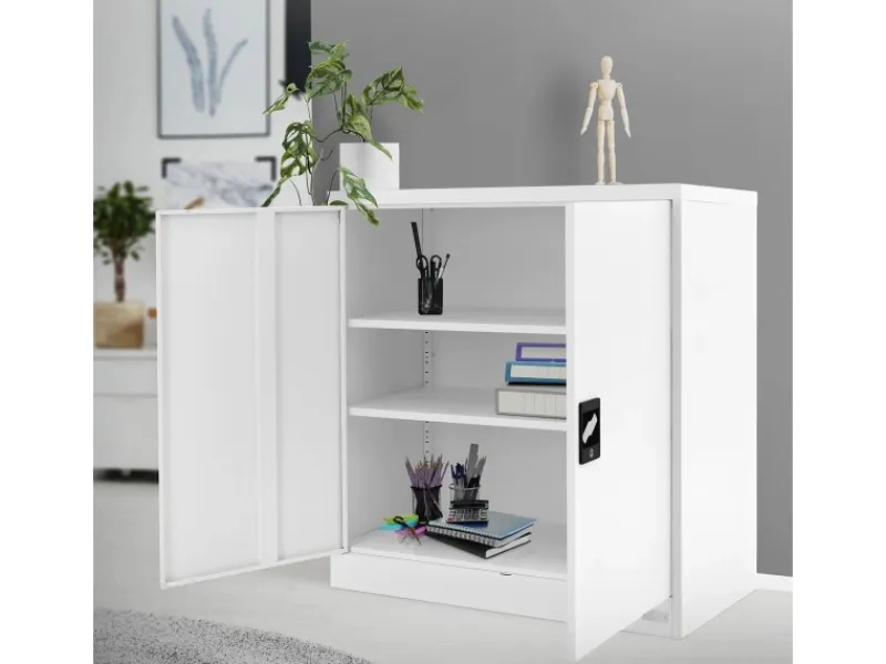 Der Korpus und die durch ein Kastenprofil verstärkten Türen, aus fast 1 mm starkem Stahlblech, mit einer langlebigen pulverbeschichteten Einbrennlackierung, sind in einem elegantem weiß gehalten und lassen sich so einfach und schlicht in jedes Raumkonzept integrieren. Die beiden Flügeltüren lassen sich vollständig öffnen und ermöglichen Ihnen jederzeit einen schnellen und gezielten Zugriff auf den Inhalt.