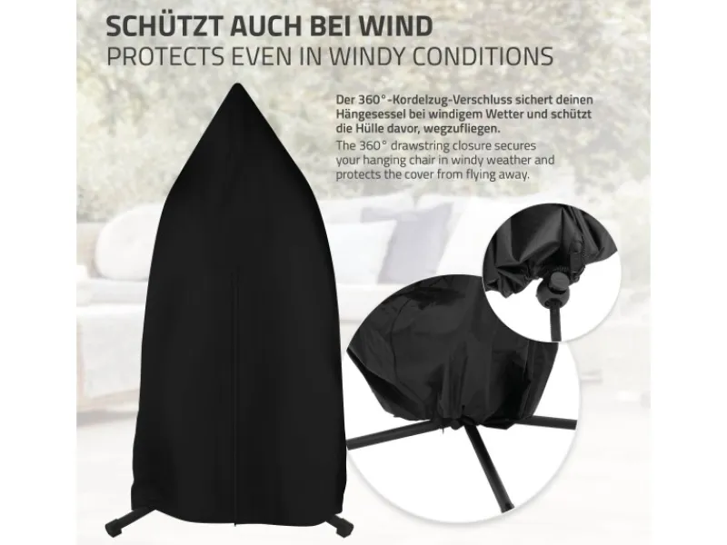 Dein Hängestuhl steht auf deine Terrasse oder in deinem Garten unter freiem Himmel? Deine Sitzkissen sind ständig feucht? Ergänze deinen Hängesessel um eine Schutzhülle. Unsere Schutzhülle ist nicht nur wasserdicht, sondern auch wetterbeständig und UV-beständig. So kannst du deinen Hängestuhl ganzjährig draußen stehen lassen. Danke dem praktischen Reißverschluss und dem 360° Kordelzug wird verhindert, dass Wasser eindringt und so deine Sitzkissen schön trocken hält. Die Schutzhülle kommt mit einer Aufbewahrungstasche zu dir nach Hause.