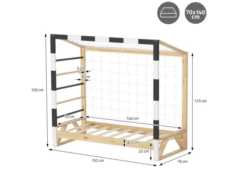 Mit unserem Holzbett Fußballtor treffen Sie eine gute Entscheidung für Ihr Kinderzimmer. Sein optimales Design und stilvolles Aussehen passen perfekt in jede Wohnung.