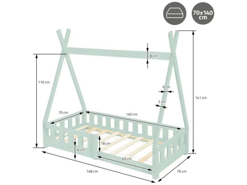 1x Kinderbett Tipi mit Rausfallschutz, inkl. Lattenrost aus Furnierholz