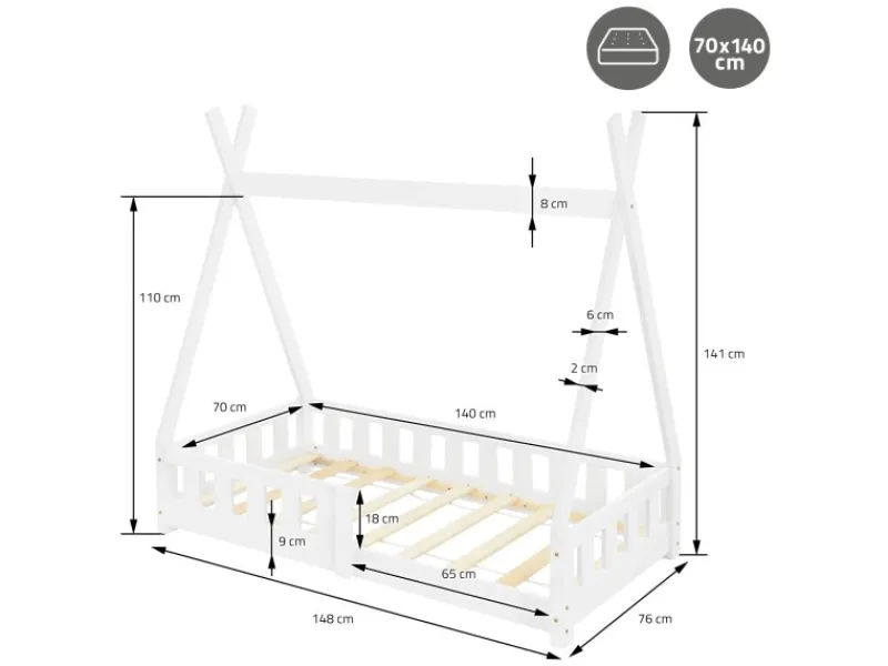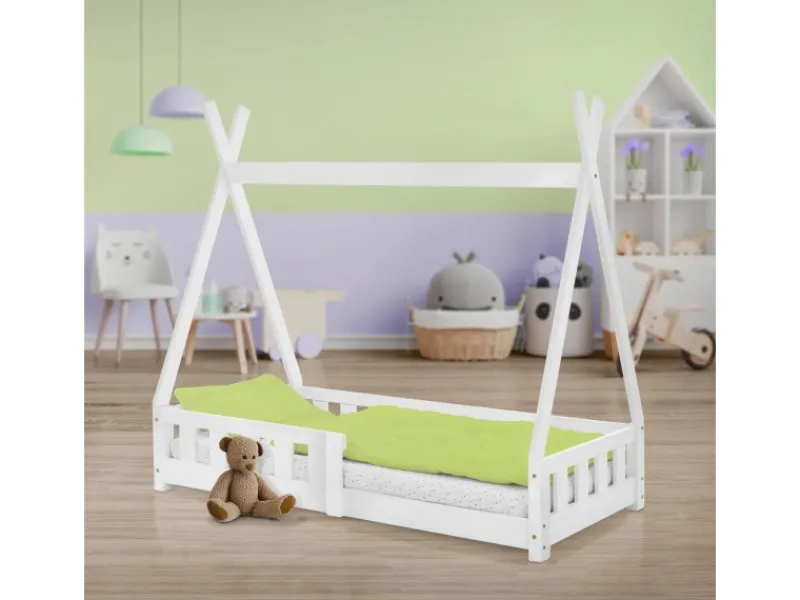 1x Kinderbett Tipi mit Rausfallschutz, inkl. Lattenrost aus Furnierholz