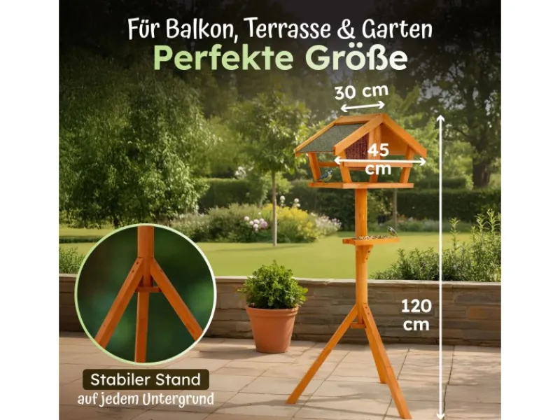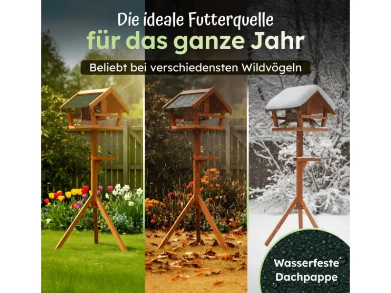 Futterhäuschen aus braunem Holz mit dunklerem Dach – ansprechend und funktional für heimische Wildvögel wie Meisen, Spatzen & Finken.Das etwas dunklere Holzdach hebt sich stilvoll vom Korpus ab und schützt Futter zuverlässig vor Witterung – perfekt für ganzjährige Vogelfütterung.Bietet viel Platz für mehrere Vögel gleichzeitig und ist ein attraktiver Blickfang für Garten, Terrasse oder Vorgarten.Lieferung erfolgt als Bausatz mit einfacher Montage – ideal für DIY-Fans, Familien oder als Geschenkidee für Vogelliebhaber.Unterstützt Wildvögel bei der Nahrungssuche, besonders im Winter – auch ideal für Vogelbeobachtung direkt vor der Haustür.