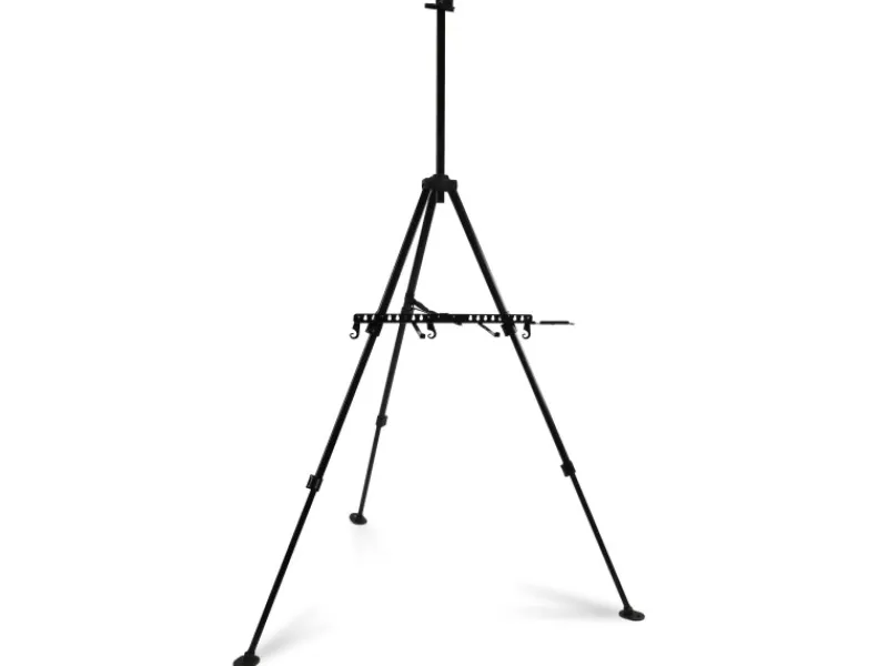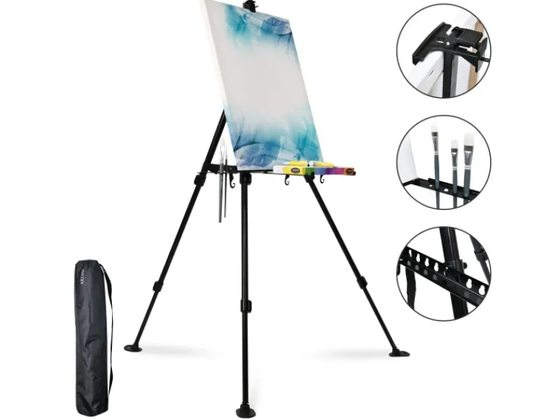 Artina Aluminium Staffelei Paris 165 cm – Für Leinwände ca. 82 cm cm HöheDie Staffelei Paris kann sowohl als Feldstaffelei als auch als Tischstaffelei benutzt werden. Zudem ist die Staffelei tragbar und stabil. Dabei kann die Leinwandstaffelei von 51 bis zu 165 cm Höhe stufenlos an Ihrer Situation angepasst werden.Die gummierten Füße, die wahlweise mit Heringen am Boden befestigt werden können, und die einzeln einstellbaren Teleskopbeine garantieren überall einen festen und ebenen Stand. Die 1000 Gramm Gewicht sind ideal, damit diese Staffelei als Wegbegleiter unverzichtbar für Sie als Künstler wird.Integrierter PinselhalterDamit Sie keine Probleme mit Ihren Malutensilien haben sind in der stabilisierenden Querstrebe 3 Haken und ein 6-facher Pinselhalter integriert. Somit können sie Ihre wichtigsten Helfer ablegen und Ihren Ideen freien Lauf lassen.Stufenlos einstellbarDa der obere Teil der Staffelei stufenlos einstellbar und auch abnehmbar ist, können jegliche Keilrahmen und Leinwände mit einer Höhe von bis zu 82 cm aufgestellt werden.