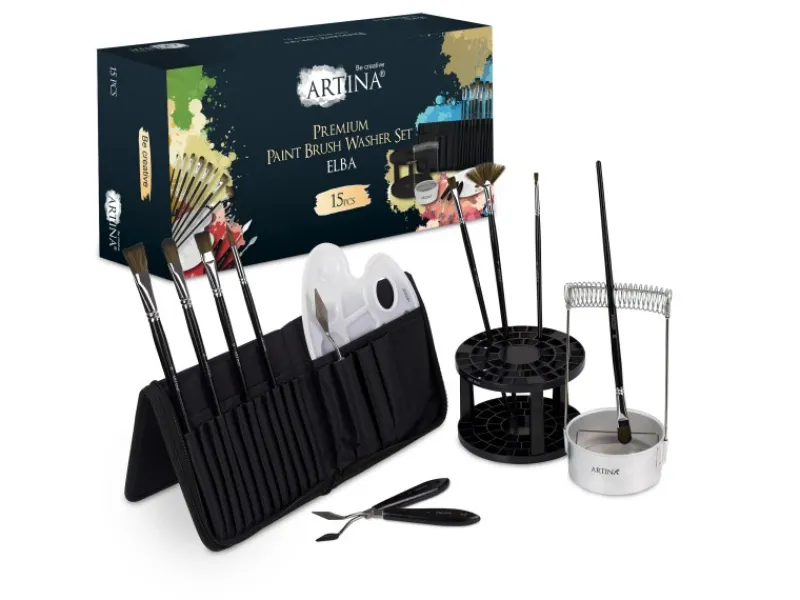 Artina Pinselhalter und Pinselwäscher Set Elba Das Malutensilien Set besteht aus 8 verschiedenen Pinseln, 3 Malspachteln, einer Mischpalette und enthält zusätzlich eine Aufbewahrungstasche, sowie einen Pinselorganizer und Pinselwascher. Die perfekte Ergänzung zu Ihrem Kunstbedarf! Das Kunst Zubehör Set ist ein ideales Geschenk für begeisterte Hobbykünstler, Anfänger und Fortgeschrittene. Das praktische Set ergänzt den eigenen Künstlerbedarf perfekt.Einfache ReinigungUm die Pinsel nach dem Malen direkt zu reinigen, fügen Sie etwas Reiniger oder Wasser direkt in den Pinselwascher aus Metall hinzu. Streichen Sie mit dem Pinsel leicht über das Sieb um Farbreste im Pinsel sanft und ohne viel Chaos zu säubern.Integrierte HaltespiraleDie integrierte Haltespirale macht das Trocknen des Kunstbedarfs so einfach wie noch nie! Drücken Sie die Spirale leicht auseinander und setzen Sie die Pinsel ein. Somit können die Pinsel direkt im Pinselwascher trocknen!Das Pinsel Malutensilien Set Elba enthält sowohl eine Tasche als auch einen Pinselhalter zur Aufbewahrung Ihres Künstlerbedarfs. So schaffen Sie allzeit Ordnung und haben all ihre Pinsel und Stifte direkt zur Hand.ProduktmerkmaleMarke: Artina Serie: Elba Setinhalt: 8 Pinsel, 3 Malspachtel, Mischpalette, Tasche, Pinselhalter und Pinselwascher Pinselwascher mit Wasserbehälter, Siebfilter und Haltespirale Besonderheiten Einfache Reinigung und Trocknung der Pinsel