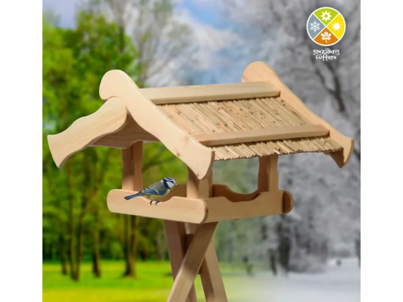 Die Futterstelle für Wildvögel wird aus hochwertigem Holz gefertigt und besticht durch seine solide Konstruktion. Das charakteristische Schilfdach verleiht dem Vogelhaus eine authentische Optik und schützt gleichzeitig das Futter vor Regen und Sonne.