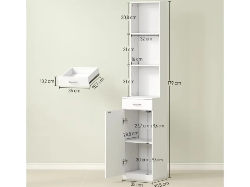 ● Geschlossene und offene Bereiche des schmalen Hochschranks halten Ihr Badezimmer ordentlich