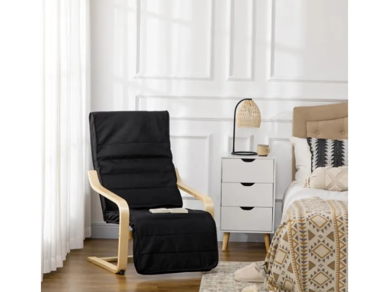 Entspannen Sie sich komfortabel auf unserem formschönen Freischwinger. Der elegante Ruhesessel überzeugt durch seine zeitlose Kombination aus hellem Holz und schwarzem Baumwollstoff. So komplettieren Sie Ihr Zuhause. Die große Sitzfläche und Rückenlehne ist angenehm gepolstert, der natürliche Baumwollbezug schmiegt sich sanft an Ihre Haut an. Für noch mehr Entspannung können Sie die Beinstütze in 5 Stufen verstellen. So können Sie die Füße hochlegen und den Moment bei einem schönen Getränk, einem guten Buch oder auch Film genießen. Das elegant geschwungene Holz ist angenehm hell und robust. Der schwarze Bezug steht in schönem Kontrast zum auffälligen Holz. Erstklassig bei Design, Komfort und Preis, mit Ihrem HOMCOM Freischwinger entspannen Sie guten Gewissens.
