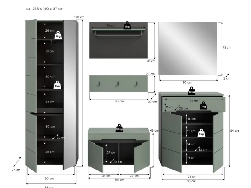 Erleben Sie mit dem 6-teiligen Garderoben Komplett-Set „Cooper“ ein Höchstmaß an Funktionalität und Eleganz in Ihrem Flur! Die vielseitige Ausstattung umfasst einen geräumigen Flurschrank / Schuhschrank mit variabler Inneneinteilung, eine praktische Schuhkommode, ein stilvolles Garderobenpaneel, eine funktionale Garderobenleiste, einen eleganten Spiegel und eine komfortable Sitzbank. Mit sechs Türen, darunter eine elegante Spiegeltür, sowie einem breiten Vollauszug Schubkasten und bis zu 12 geschlossenen Fächern bietet die Garderobe sehr viel Stauraum für Ihre Kleidung und Accessoires. Die durchdachte Ausstattung beinhaltet zudem fünf Kleiderhaken, zwei Kleiderstangen und eine Hutablage. Front und Oberböden in der Farbe Salbei Grün verleihen dem Garderoben Set einen modernen Look, während der Korpus und die Absetzungen in Basalt grau für einen stilvollen Kontrast sorgen. Dank Soft-Close-Funktion und grifflosem Design überzeugt die 6-teilige Garderobe nicht nur durch ihre ästhetische Erscheinung, sondern auch durch ihre hochwertige Verarbeitung. Mit den Maßen von ca. 255 x 190 x 37 cm bietet „Cooper“ reichlich Platz für all Ihre Bedürfnisse im Flur.