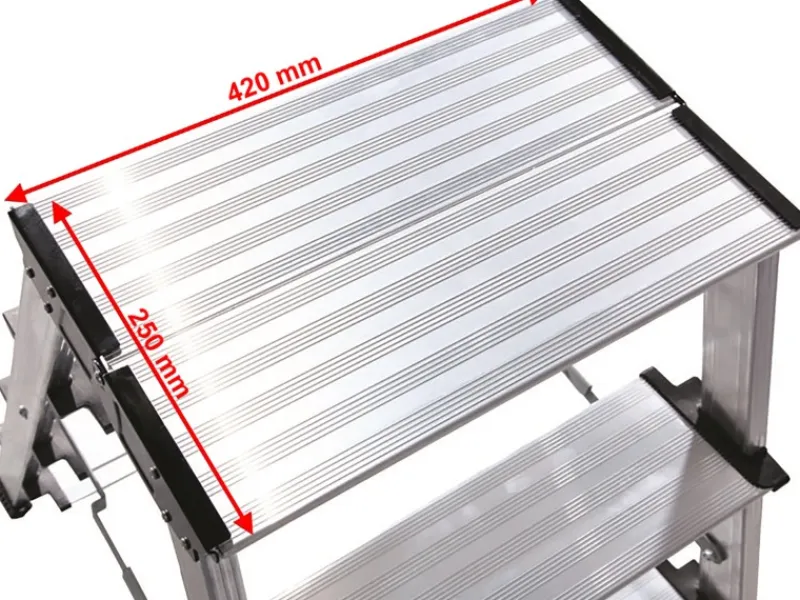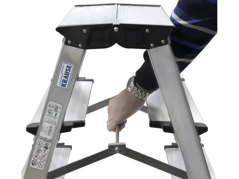 Eine einhändig bedienbare Multifunktions-Klappsperre gewährleistet Stabilität und erleichtert die Handhabung. Große, rutschhemmende, profilierte sowie bodenschonende Fußkappen bieten zusätzlichen Halt. Dank seines durchdachten Designs ist der Klapptritt außerdem leicht verstaubar.