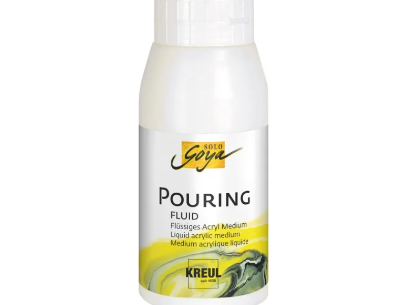 Mit dem Pouring Fluid Solo Goya Transparent 750 ml erzeugen Sie unvergessliche Kunstwerke mit Effekten, die an Galaxien erinnern. Das Pouring Fluid Solo Goya bietet das flüssige Acryl-Medium für Gieß- und Fließtechniken mit Acrylfarben. Es optimiert das Fließverhalten von Acrylfarben, ohne die Farbbrillanz zu verändern. Das Solo Goya Fluid kann in beliebigem Verhältnis mit Acrylfarbe gemischt werden. Der Reiz des fließenden Pouring Fluid entfaltet sich und einzigartige Muster entstehen. Es kann auch pur als transparenter, hochglänzender Lack verwendet werden.