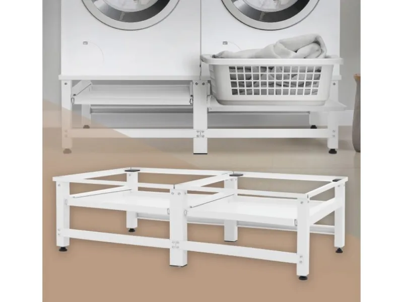 Das stabile und robuste Doppelpodest sorgt für eine Erhöhung der Position, bei allen gängigen Waschmaschinen und Trocknern. Dadurch wird das Beladen und Entnehmen der Wäsche komfortabler.
