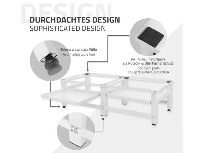 Waschmaschinenuntergestell mit ausziehbarer Ablageplatte? Kein Problem. Dieses Untergestell aus Stahl ist die optimale Erhöhung für deine Waschmaschine und Trockner. Das Stahlgestell verfügt über eine ausziehbare Platte, worauf du kleinere Dinge ablegen kannst und hast sie somit immer griffbereit. Das Gestell ist für Waschgeräte mit einer Breite bis zu 60 cm. Sollte dein Boden uneben sein, helfen dir die höhenverstellbaren Füße. Diese kannst du einfach raus oder reinschrauben und so die Höhe anpassen. Auf den vier Abstellpunkten des Rahmens befinden sich Schaumstoffpads, welche eine dämpfende Wirkung haben und so die Lautstärke der Maschinen verringert.