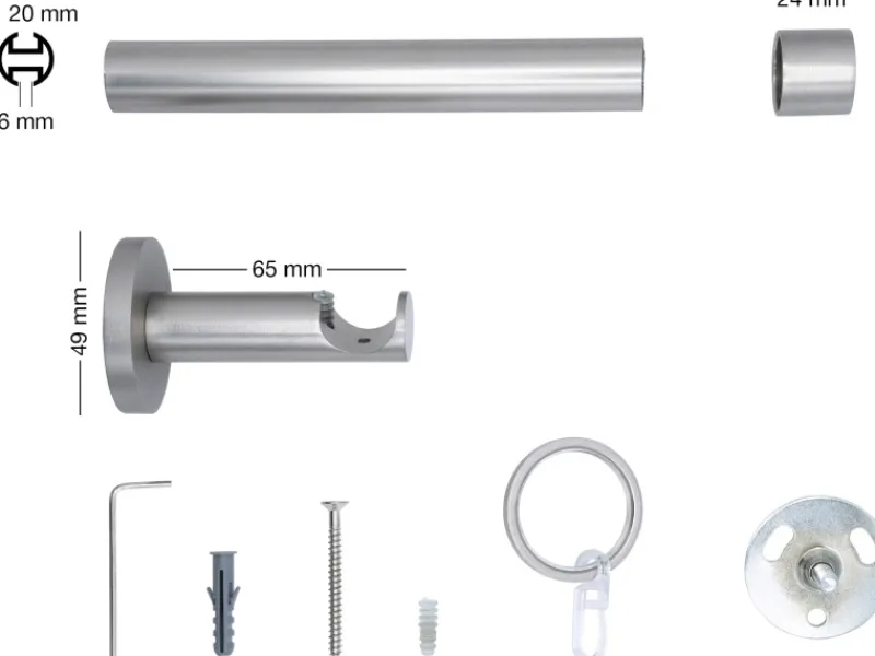 1 mydeco Ø 20 mm Rohr der Länge 140 cm, 2 Endstücke cap, 2 Träger, 20 Ringe, Schrauben, Imbus.