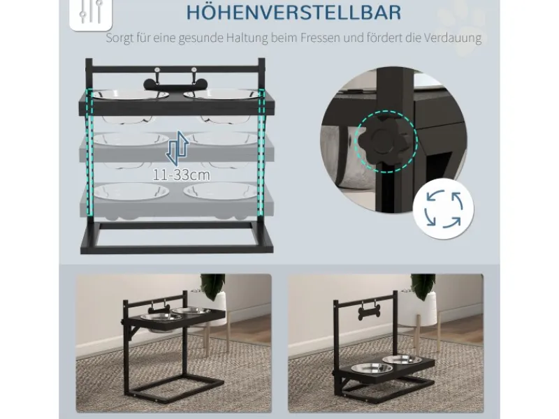 Mit unserem erhöhten Hundenapf von PawHut verwöhnen Sie Ihren vierbeinigen Freund wie ein König. Die verstellbare Höhe sorgt für ein maßgeschneidertes Esserlebnis und fördert eine bessere Haltung und Verdauung. Aber das ist noch nicht alles! Unser Futternapf hat eine einzigartige Metallplatte in Form eines Knochens. So können Sie ihn mit dem Namen Ihres Hundes personalisieren. Praktisch, elegant und genau das, was Ihr Haustier verdient.