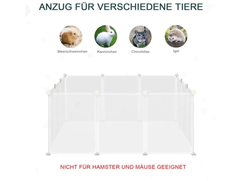 Dieser Haustier-Laufstall von PawHut wurde entwickelt, um ein fantastisches Zuhause für Ihre Haustiere zu schaffen. Es bietet einen großen Raum für kleine Tiere zum Ausruhen und Spielen. Sie können es in verschiedenen Konfigurationen aufbauen, um es an die Gestaltung Ihres Zimmers anzupassen und seine Form nach Belieben zu verändern. Geeignet für die meisten Kleintiere wie Kätzchen, Kaninchen, Chinchilla, Igel, Meerschweinchen. Es ist großartig, um Ihnen Ruhe mit Ihren Tieren zu geben.