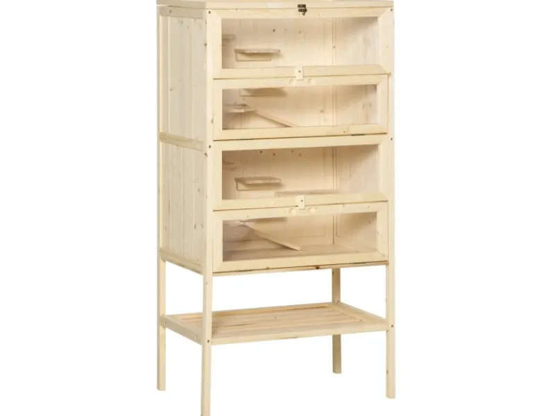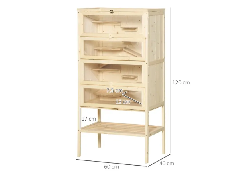 Dieses schöne, fünfstöckige Zuhause für kleine Nagetiere von Pawhut besteht aus 2 voneinander getrennten. Der Käfig besteht aus Tannenholz und bietet nicht nur viel Platz, sondern auch Beschäftigungsmöglichkeiten. Der aufklappbare Deckel ist mit einem Drahtgitter versehen, sodass der Stall gut belüftet wird und sehr sicher ist. Durch die großen Glasscheiben wird mit reichlich Tageslicht durchflutet. Die Seitenfenster und der Deckel sind aufklappbar, sodass eine gute Reinigung möglich ist.