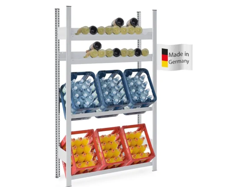 Die Produktion des Regals erfolgt nach höchsten Qualitätsstandards in Deutschland. Die Fertigung ist nach ISO 9001 zertifiziert. Das Getränkekisten- & Flaschenregal wird kompakt und sehr gut verpackt geliefert und kann kinderleicht innerhalb von 15-20 Minuten aufgebaut werden. Selbstverständlich sind die Fachböden flexibel in der Höhe verstellbar. Durch die flexible Einstellungen, lassen sich auch andere Kisten abseits von Getränkekisten sehr praktisch lagern.