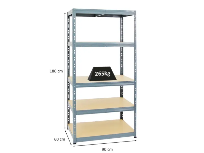 Das Schwerlastregal ist 180 cm hoch, 90 cm breit und 60 cm tief. Die Farbe ist Grau