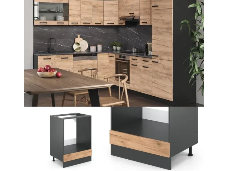 Der Küchenschrank für den Einbauherd hat Breite 60 cm, Höhe 81,6 cm und Tiefe 46 cm