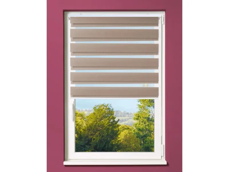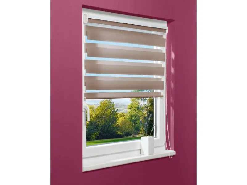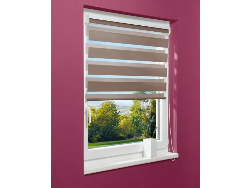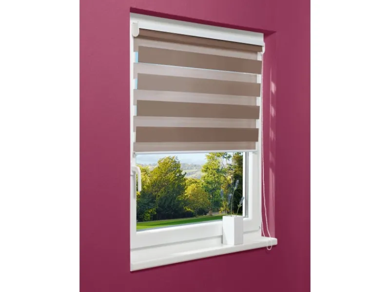 Mit dem modernen OBI Doppelrollo Avila in der Farbe Braun und dekorativem Kassettenfach schaffen Sie immer die gewünschte Lichteinstellung für Ihren Wohnraum. Wählen Sie individuell zwischen Transparenz und Sichtschutz und regulieren Sie so stufenlos das Raumlicht. Das zu 100 % aus Polyester gefertigte Doppelrollo besitzt abwechselnd transparent und lichtundurchlässig gewebte Streifen, die wahlweise übereinander oder versetzt eingestellt werden können. Die transparenten Streifen ermöglichen viel Sonneneinstrahlung und freie Sicht, während die lichtundurchlässigen Streifen Ihren Raum frei von blendendem Licht und unerwünschten Blicken von draußen halten. Ein einfaches Handling gewährt der komfortable Seitenzug, welcher wahlweise rechts oder links angebracht werden kann. Das Doppelrollo kann durch Bohren an der Wand oder an der Decke montiert werden. Das dazu nötige Befestigungsmaterial ist ebenfalls im Lieferumfang enthalten. Es besteht zudem die Möglichkeit, das Rollo ohne Bohren auf dem Fensterflügel zu befestigen. Das OBI Easy Fix N1 Befestigungsmaterial ist separat erhältlich.