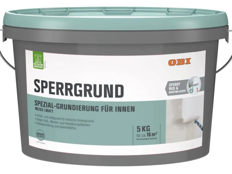 OBI Sperrgrund Weiß matt 5 kg zur Vorbehandlung von kritischen Untergründen, die zum Durchschlagen von färbenden Inhaltsstoffen führen können.