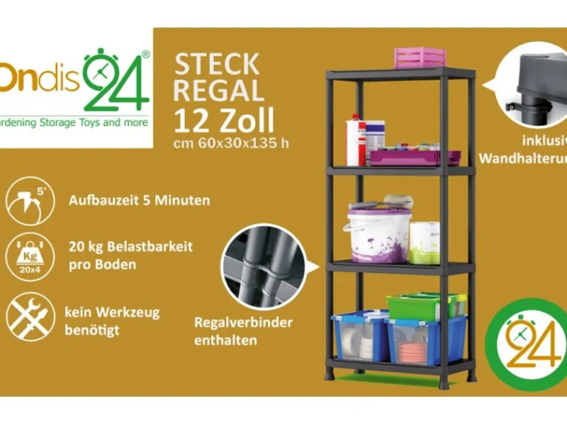 Sobald der Herbst anbricht, fangen wir an unsere Sommermöbel, Gartenaccessoires und Blumentöpfe wieder in den Keller zu räumen, doch das kann zu einem echten Problem werden. Über den Sommer hinweg haben sich viele neue Gartenutensilien angesammelt, die nun keinen Platz mehr finden. Damit Sie Ihre Schätz jedoch nicht in der Ecke stapeln müssen, bieten wir Ihnen ein Schwerlastregal (TÜV/GS Rheinland S60029472). Dieses Regal hat eine Höhe von ca. 135 cm und steht auf einer Standfläche von ca. 60 x 30 cm. Es beinhaltet vier geschlossene Böden, worauf Ihre Wertsachen Platz finden können. Aufgrund des sehr stabilen und hochwertigen Materials kann ein Boden mit bis zu 20 kg belastet werden. Der robuste Kunststoff sorgt für ein stabiles Konstrukt. Da dieses Haushaltsregal keine Metallteile enthält, droht keine Korrosion. Das Steckregal ist somit wetterbeständig und wasserfest. Sie können sich somit zwischen einem Gebrauch im Garten oder im Haus entscheiden. Für die Verwendung in einem feuchten Kellerraum ist das Kunststoffregal ebenfalls geeignet, da die Füße, welche am untersten Boden angebracht werden, hoch genug sind, um einen Ausreichenden Abstand zum Fußboden herzustellen.Eine Besonderheit des Regals ist, dass es mit einem einfachen Stecksystem aufgebaut werden kann. Man benötigt dazu kein Werkzeug und ist innerhalb ca. 10 Minuten mit der Montage fertig. Im Zubehör befinden sich zwei zusätzliche Wandhalter, womit das Regal an der Wand befestigt werden kann. Je mehr Sie in das Regal stellen, desto stabiler wird es.