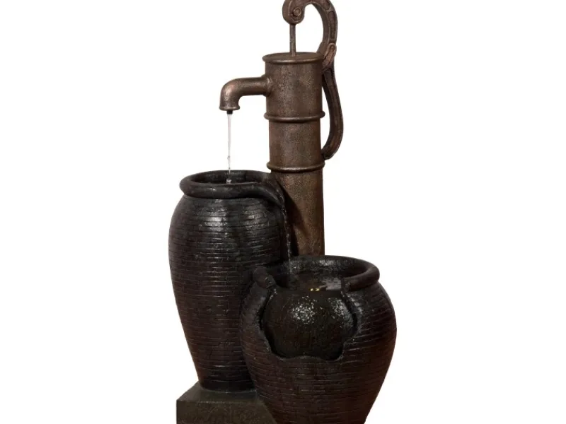 Das aus dem Wasserhahn fließende Wasser plätschert beeindruckend in zwei runde Auffangbecken nach unten. Warmweiße LEDs ergeben ein harmonisches Lichtspiel. Der Gartenbrunnen/Zimmerbrunnen ist durch seinen geschlossenen Wasserkreislauf im Innen- und Außenbereich verwendbar.