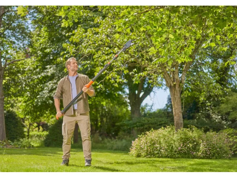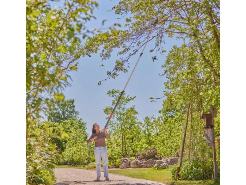 Der Gardena StarCut Pro L bietet eine hervorragende Reichweite, komfortabel vom Boden aus – ganz ohne Leiter. Der verbesserte untere Griff lässt sich sicher und bequem greifen; ein T-Griff sorgt für besseres Halten und Stabilisieren.