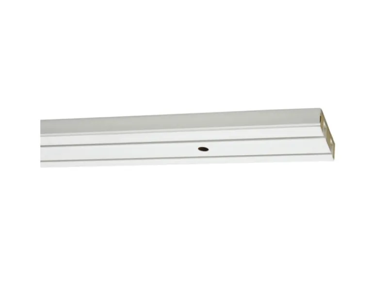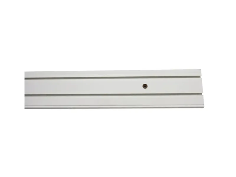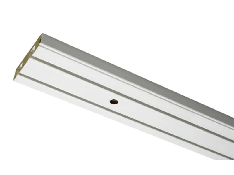 Die Schiene aus Holzwerkstoffen ist mit weißem Kunststoff ummantelt und für die Deckenmontage bereits vorgebohrt. Die 2-läufige Schiene eignet sich für die Befestigung von 2 Gardinenläufen. Eine Blende kann durch einfaches Aufclipsen am Profil der Vorhangschiene befestigt werden.