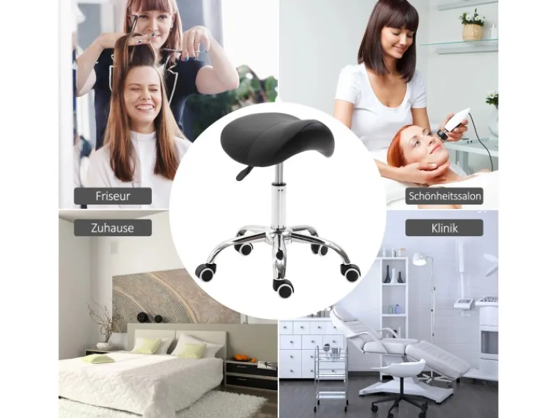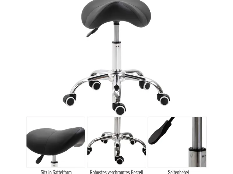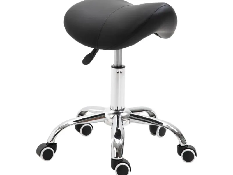 Dieser ergonomische Rollhocker in Sattelform sorgt durch seine besondere Form des Sitzes automatisch für ein aufrechtes Sitzen, welches die Wirbelsäule entlastet. Der Praxishocker ist mit einer komfortablen Gasfeder ausgestattet, höhenverstellbar und drehbar. Die gepolsterte Sitzfläche ist aus glattem, pflegeleichtem Kunstleder hergestellt. Der Kreuzfuß des Hockers ist mit fünf stabilen Nylonlaufrollen ausgestattet. Der praktische Hocker ist ideal für den täglichen Gebrauch zu Hause, in jedem Friseursalon, Kosmetik-Studio oder in Büros.