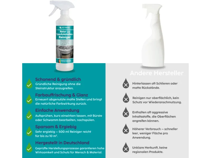 Vor der Reinigung sollte die Oberfläche auf Raumtemperatur gebracht werden. Anschließend den Reiniger satt auf die verschmutzte Fläche aufsprühen und mit einer Bürste oder einem Schwamm einarbeiten. Nach einer Einwirkzeit von ca. 5 Min die gelösten Verschmutzungen mit einem saugfähigen Tuch aufnehmen und mit klarem Wasser gründlich nachwaschen. Bei besonders hartnäckigen Flecken kann der Vorgang wiederholt werden. Für die regelmäßige Pflege wird die Verwendung von HOTREGA® Natur- und Specksteinofen-Pflege empfohlen.